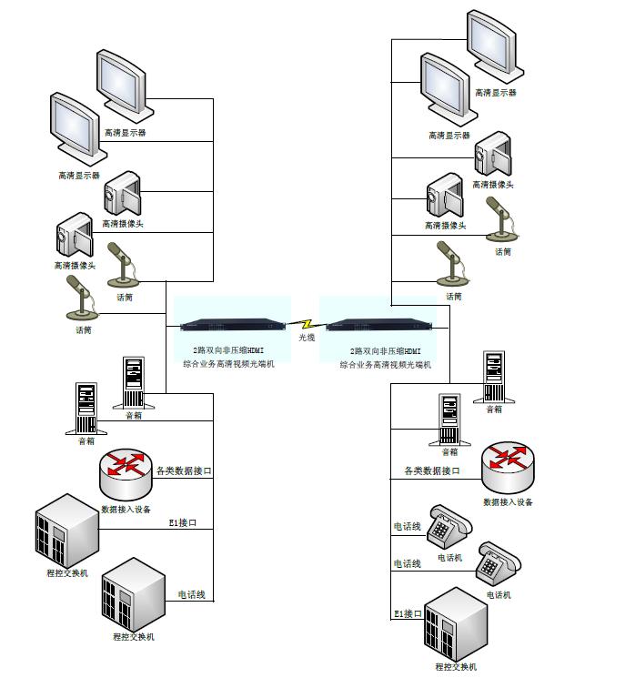 在光纖上傳輸2路雙向非壓縮HDMI+2路雙向音頻+百兆網絡或千兆+1-32路電話磁石等業務+4-8E1等,1U機架式設備 |