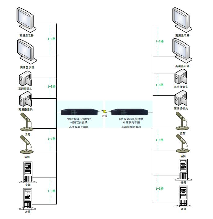 8路雙向非壓縮HDMI+8路雙向音頻高清數字光端機是北京聖鈞科技發展有限公司採用自主知識産權的大規模集成電路研發産品,通過一芯單模光纖傳輸1路雙向無壓縮HDMI、1路雙向音頻、百兆以太網、電話、磁石、數據等業務。 在多媒體應用系統中,往往需要把HDMI數字視頻信号、音頻信号、控制信号進行遠距離、無失真的並行傳輸。但使用普通的電纜長距離傳輸時,總會出現輸出信号差,容易受幹擾,顯示出來的圖像會出現模糊、拖尾、分色等現象。同時傳輸距離短,要多條電纜才能同時傳輸這些信号,不能滿足多媒體信息發布等場合長距離傳輸的要求,使用HDMI光端機進行傳輸,完全解決瞭此類問題,傳輸距離1米-80公裏。同時,光端機傳輸具有衰減小、頻帶寬、抗幹擾性能強、安全性能高、體積小、重量輕等優點,所以在長距離傳輸和特殊環境等方面具有無法比拟優勢。